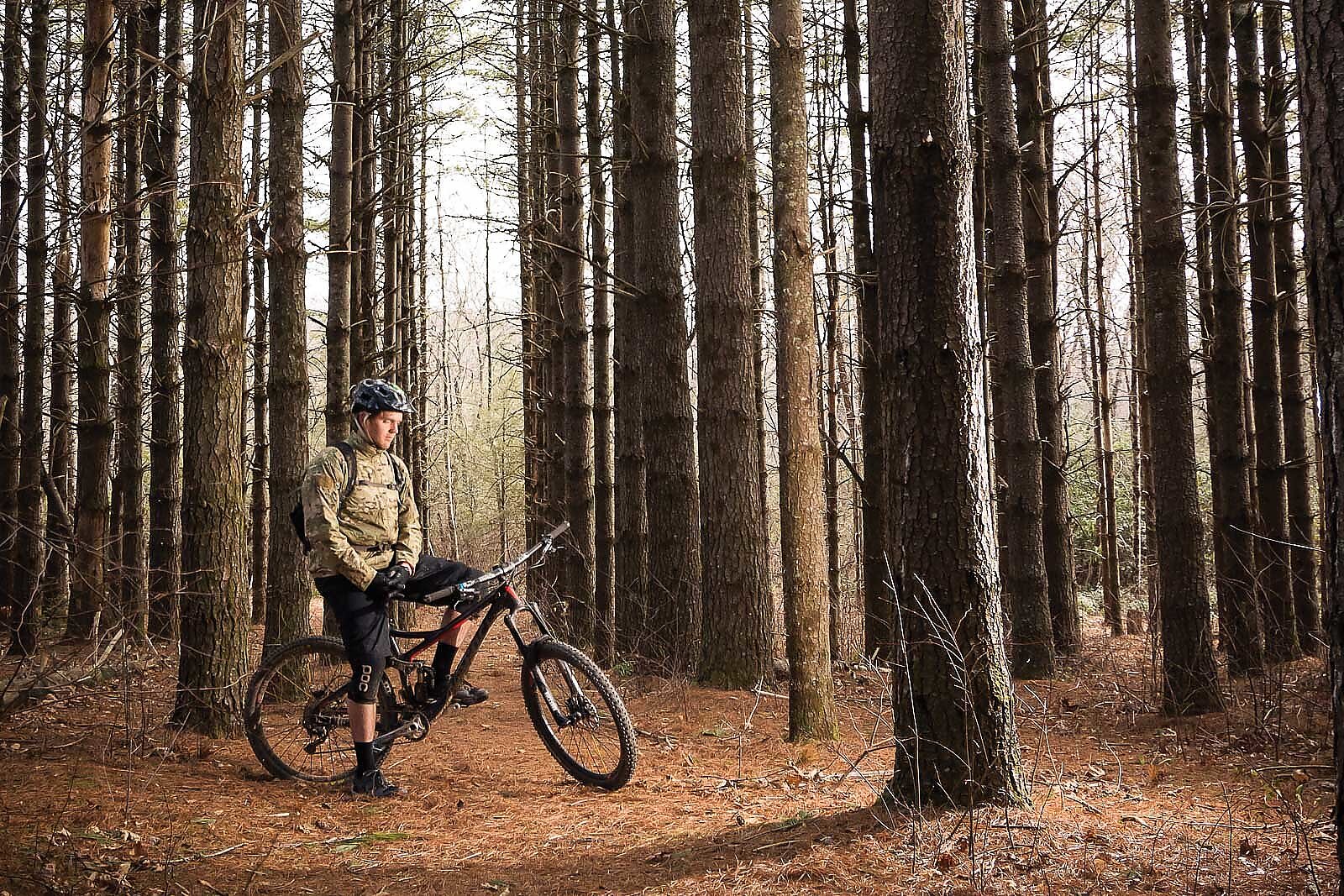 The snow is still falling on Rocky Knob’s Boat Rock Trail, as we crunch and slip our way over frozen dirt and powder-covered roots. We’re in no rush, but Haren’s intensity still surrounds him as we stop for a moment to let Blue catch up. The body armor has been replaced by POC kneepads, and he handles his bike with an exacting precision expected from one of our nation’s most elite soldiers. While we wait I ask Tim about his combat team, and what it’s like to live and work with a group of people whose lives depend on each other.