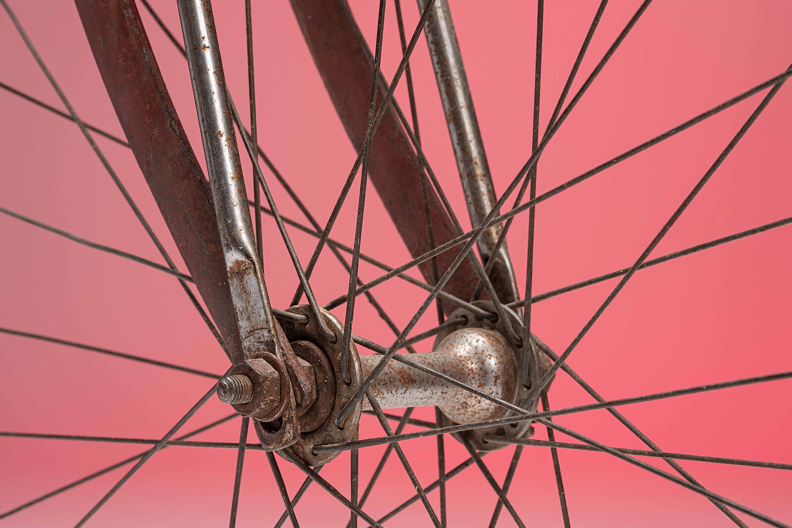 This exact model features a silver truss rod fork brace. Sliding over the steer tube and fixed by front axle bolts, these silver truss rods provided additional support and structural integrity to the otherwise simplistic fork. In addition to added rigidity, some truss rods provided mounting points for fenders, racks, and lights. For the sport's earliest adopters, any additional rigidity was a welcome modification in hopes of increasing reliability.