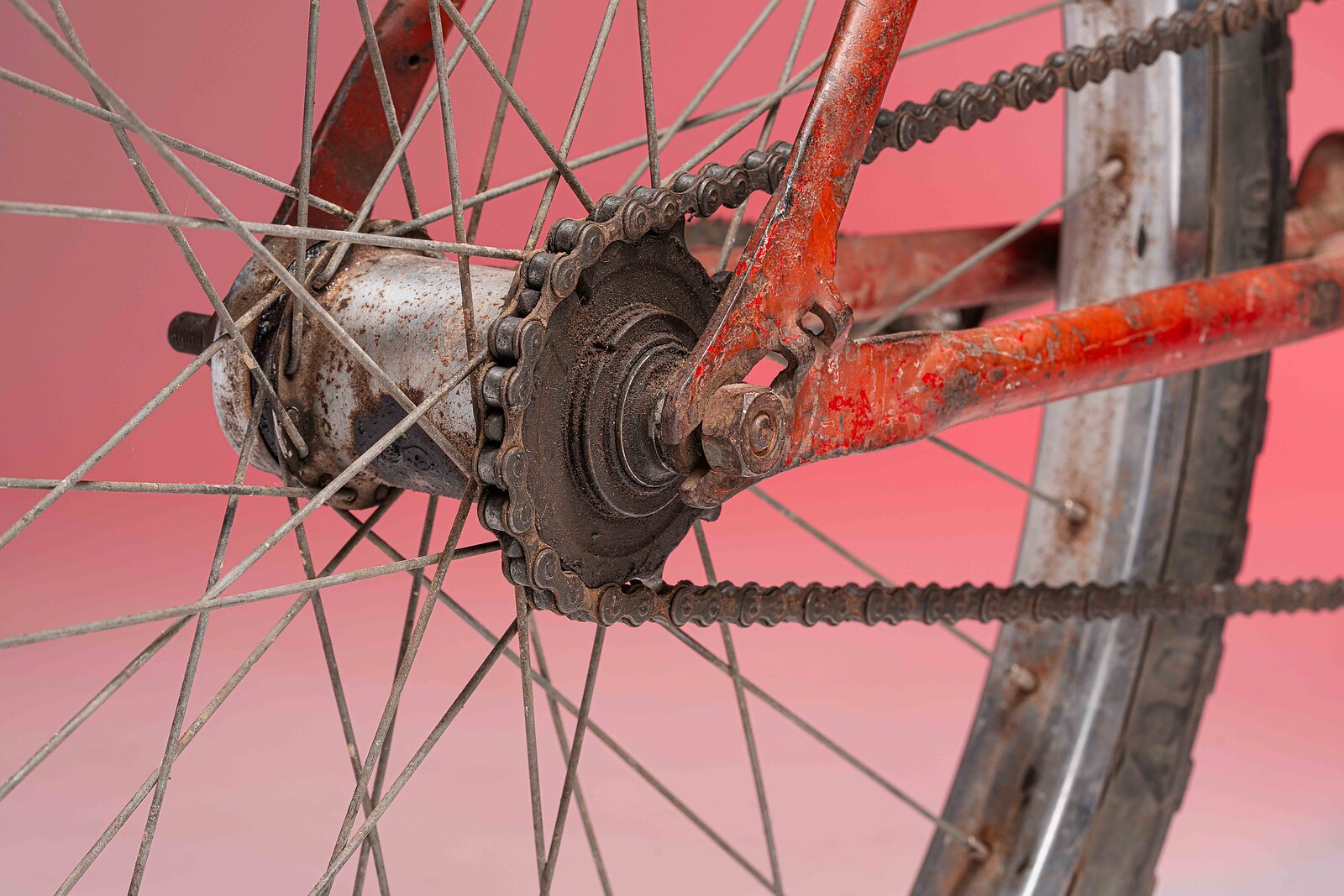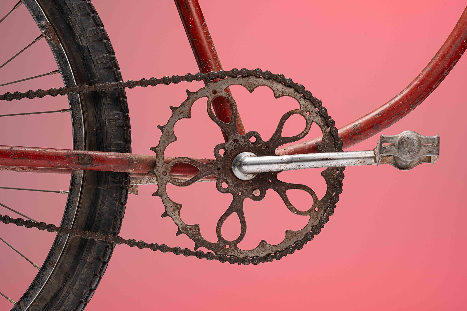 Most early Klunkers relied upon a single-speed drivetrain such as this one. These early drivetrains had inch-pitch chains and chainrings, meaning that their chain link and tooth spacing was a full inch, not the .5 inch that is prevalently seen today.