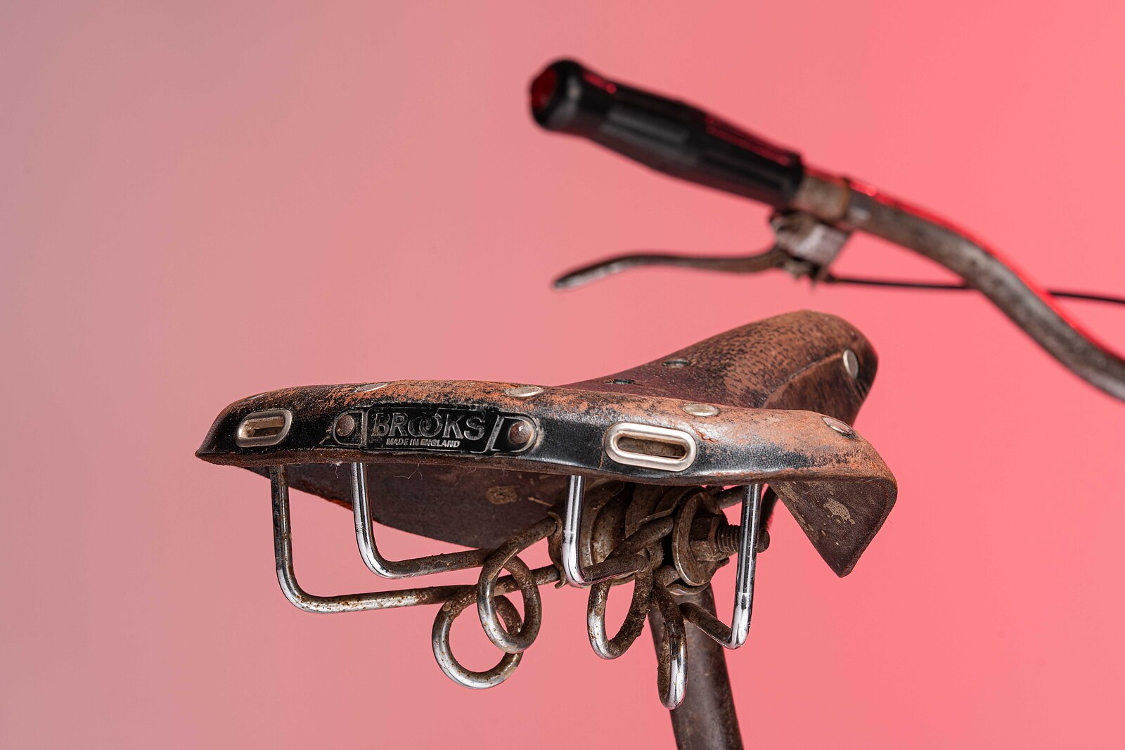 This Schwinn features a traditional Brooks saddle with sprung rails. Founded in 1866, Brooks was an established manufacturer in the cycling industry. Even in the modern era, their saddles maintain a similar silhouette to early models found on these pre-war cruisers.