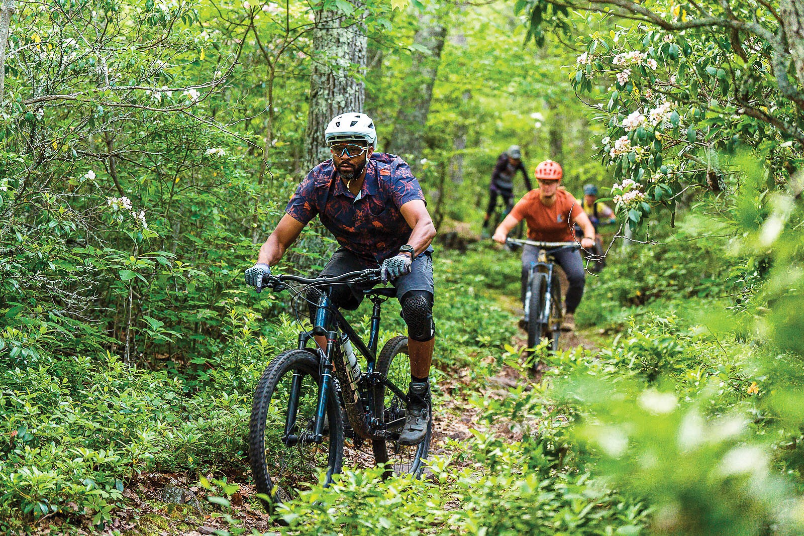 The top section reminded the group of Reddish Knob as bench-cut trail sprinkled with the usual mid-Atlantic seasoning of chunky rocks kept riders on their toes. Toward the bottom, the trail gradient turned properly steep and allowed riders to practice dialing it back to stay well within their personal comfort levels. The blooming rhododendron quickly made the green tunnel go into hyperdrive as riders felt the rush of letting off of their brakes to quickly gain speed.