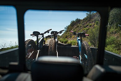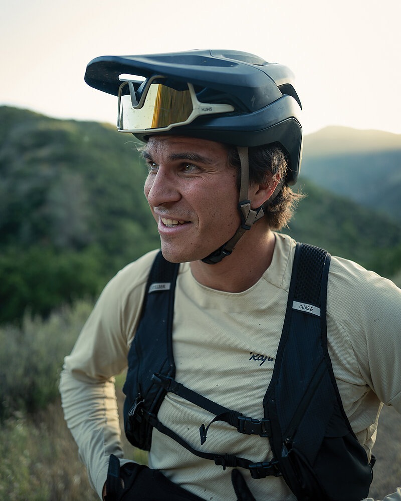 We deemed it appropriate to begin our journey to the deep at the day’s highest point. A 40-min - ute shuttle in early morning light to basecamp at 7,000 feet atop the Topatopas laid the foundation for a rip on the e-bike—forgive me, but time was of the essence—past a U.S. Forest Service gate and up an access road to Reyes Peak. From here, Brad, Amado, and I gazed down upon the sun rising over the Mojave Desert before descending north toward its warmth into Boulder Canyon.