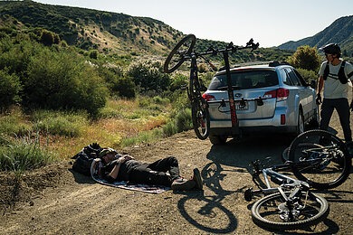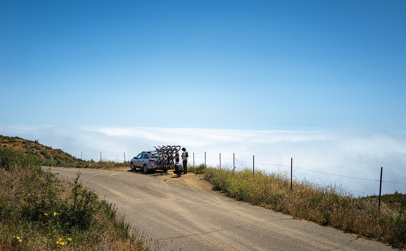 This trail first appears on maps from 1908, when the forest was still known as the Santa Barbara Forest Reserve. Likely established by Indigenous Chumash and used for thousands of years, it marks a clear path down a ravine, descending from pine forest to chaparral to cacti in a complete tour of central Californian ecological zones. On the trail, our tire lugs dig into loam, dust, and sandstone slab as we search for grip over the course of five miles and 3,300 feet of elevation drop between firs, oaks, mountain mahogany, and prickly pear. In less than 20 minutes, we’re sitting next to a wildfire ranger station, loading bikes onto a rack, and driving back to base camp. Back in turbo mode, we make quick work of getting back to the trailhead.