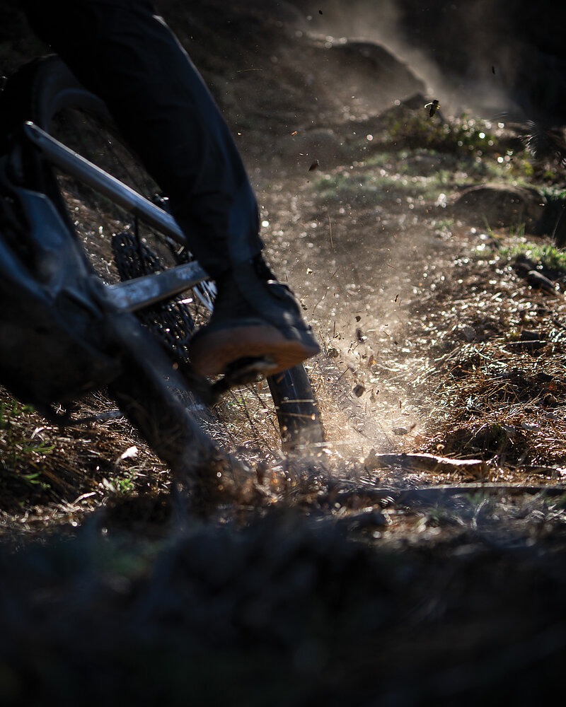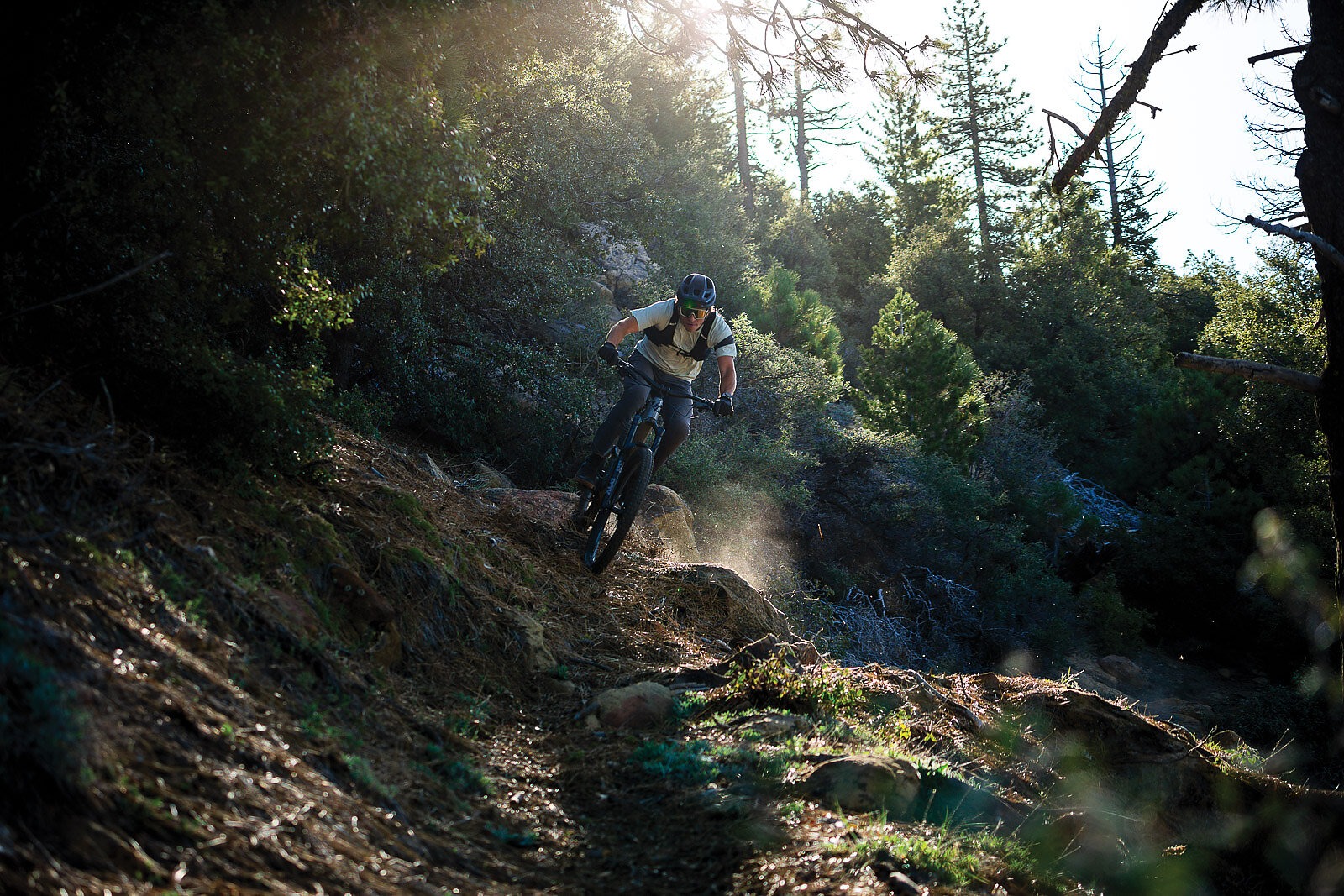 As the scents of citrus and creosote drift up from onshore ocean winds, a descent of 3,000 feet over six miles separates us from town. Gridley, a trail built solely for the purpose of tapping a natural spring so that a CEO from Standard Oil in the late 1800s could water his orchard, reflects its past as a roadbed designed for the traversing of mules and Model T cars with gentle grades and a forgiving lack of technical sections. Pratt, on the other hand, is an old horse trail from town to creek that is essentially one continuous rock garden. At the bottom of this trail sits my home, where a bike swap is made from my Specialized Kenevo SL e-bike to an analog Enduro.