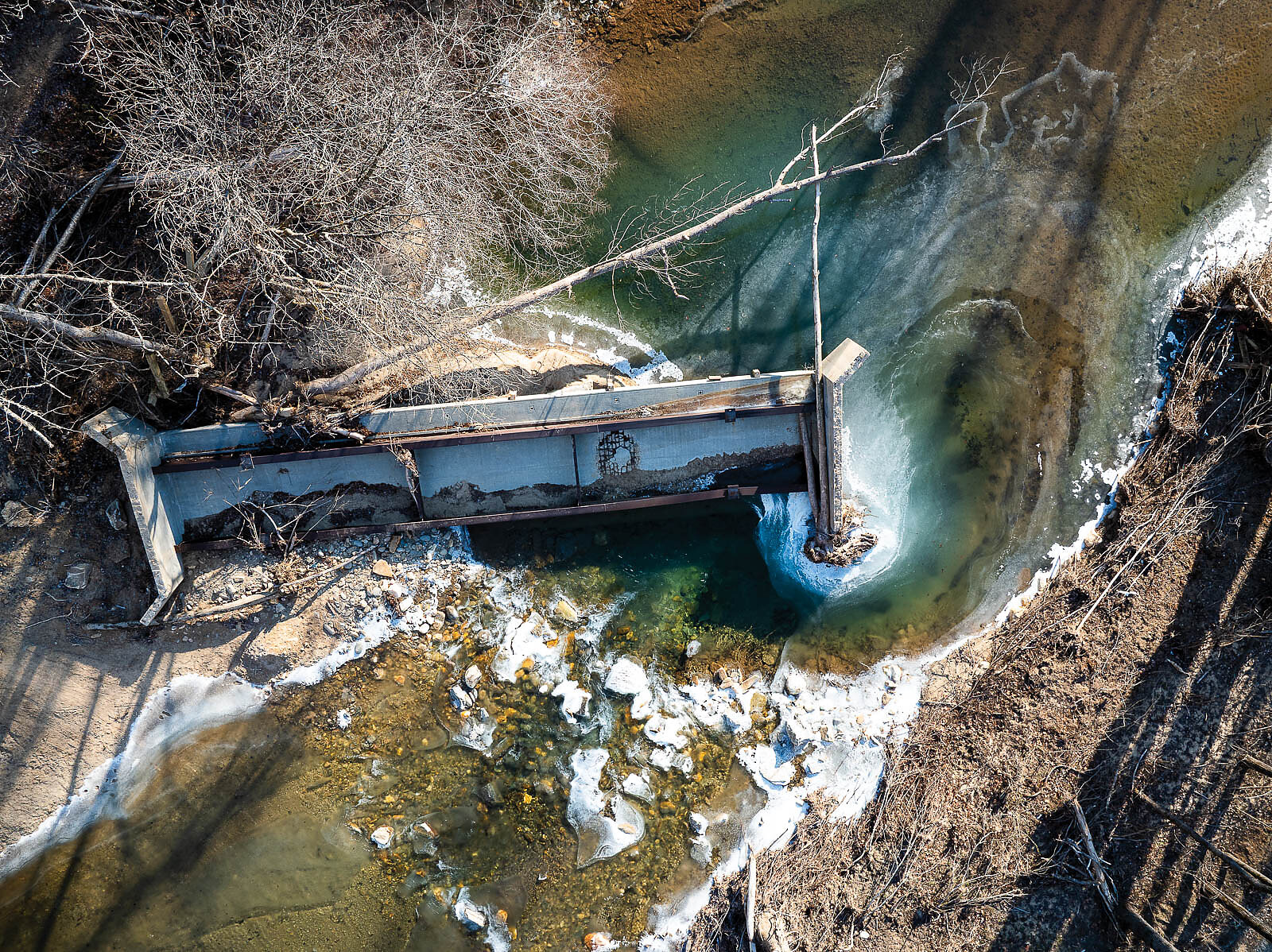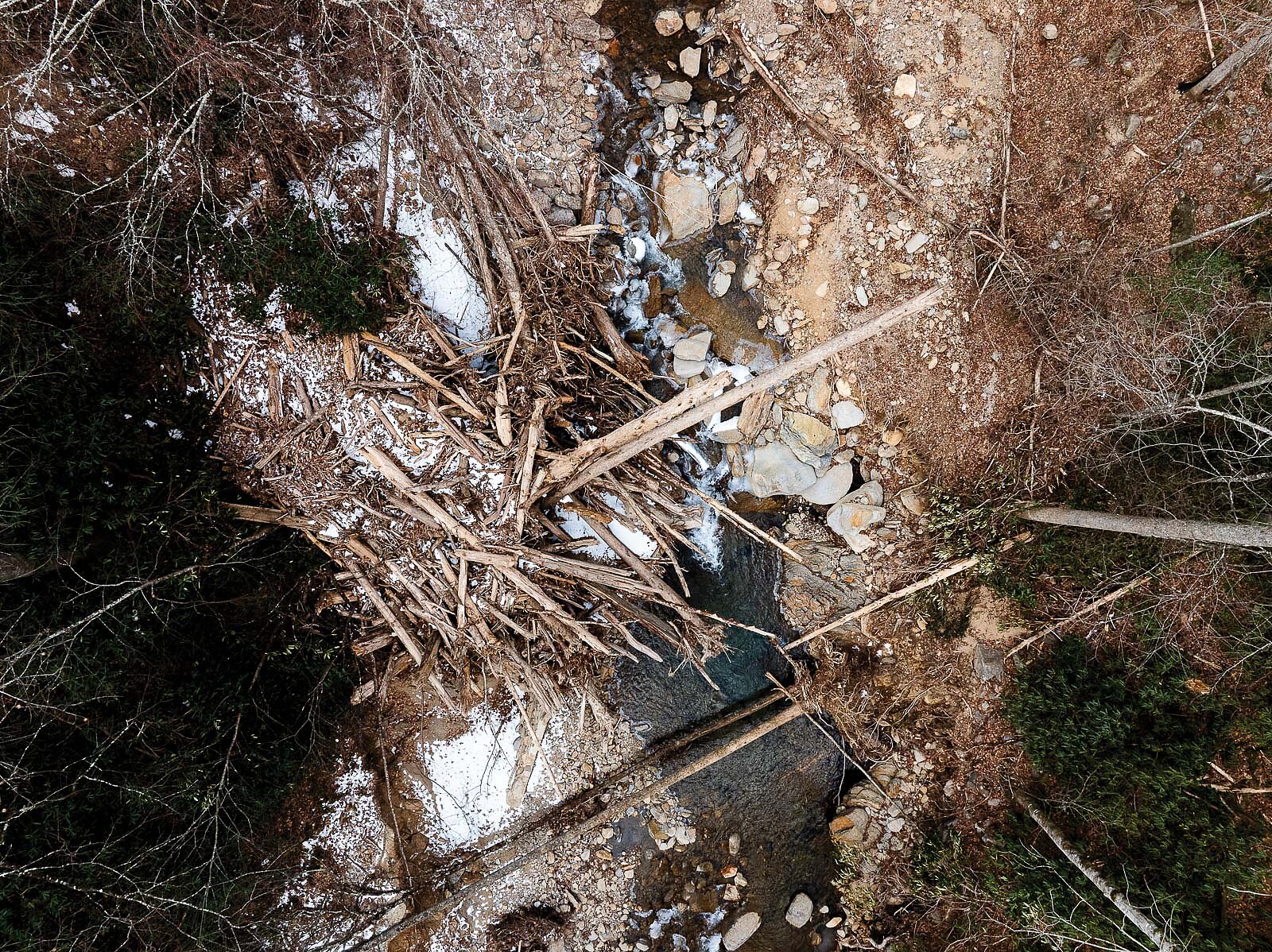 Standing on one side of Curtis Creek on a crisp day in early 2025, a major drainage of the Catawba River watershed, Jennings looked across where a bridge used to be. On the other side is the parking lot to the centerpiece of the Old Fort Trail Complex: the now inaccessible Gateway Trails. Here, the storm ripped a mammoth concrete bridge out of its foundation and turned it wrong side up downstream.