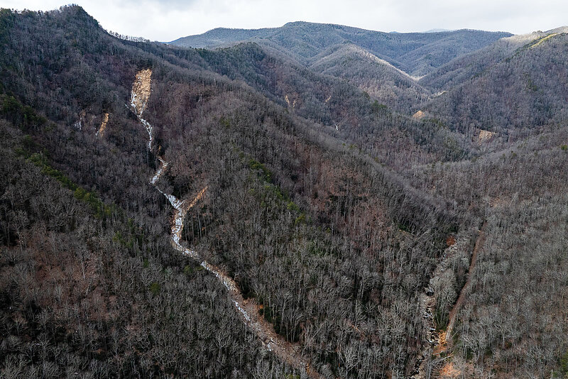 The other districts of Pisgah, the Appalachian and Grandfather districts east of Asheville, are home to steeper, more rugged, more remote terrain than the Pisgah District near Brevard. These slopes, dominated by the 6,684-foot Mount Mitchell, the highest peak east of the Mississippi River, and Grandfather Mountain, represent the most peak to valley elevation change on public lands in the East. These mountains rise like a wall out of the piedmont and faced every bit of Helene’s full fury.