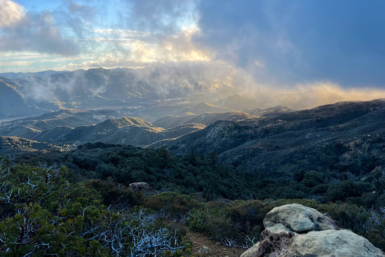 By 1982, Victor Vincente, an oft-forgotten legend of the invention of mountain biking, held a two-day bike race from the town of Ojai, across this trail to hot springs for a night of revelry, followed by a trip up Howard Trail and down a fire road that had, by then, been built and abandoned as an access road for the construction of the fire tower. The trail burned under the flames of wildfire in 2002, 2006, and 2017, each time becoming more impassable as shale eroded over its tread just as fast as chaparral could regrow in the negative space of travel just above.