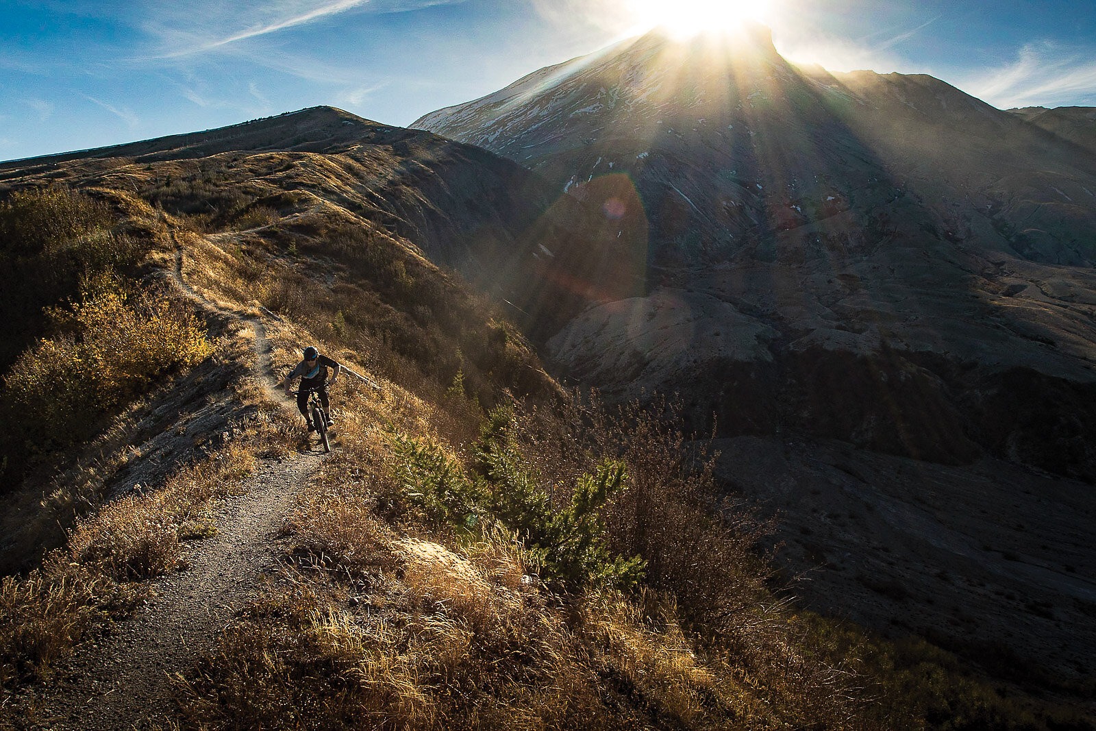 This is really just one of those “right-place, right-time” moments. My buddy Cody Olsen and I were out for a big day of riding. We were tired, the light was harsh, and our stoke level wasn’t mega high. We stopped on the ridgeline to eat some lunch and drink a beer, when all of a sudden the sun dipped behind the peak of Mount Saint Helens and created these crazy light rays. Cody had to scramble to ride the ridgeline before the moment was over. Sometimes you just have to strike while the iron is hot.