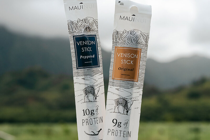Maui Nui Venison Sticks - $64.50 (per 12 pack) | A protein snack free from isolates and additives, delivering an industry-leading protein-to-calorie ratio alongside a diverse array of vitamins, minerals, and antioxidants, singularly sourced from Mauiʻs 100% wild Axis deer. The Maui Nui Peppered Stick features a delicious blend of spices alongside black and red pepper for just the right amount of heat. Created for customers who prefer to eliminate all sugars from their snack, the Peppered Stick is Keto approved and packs an extra gram of protein (10 grams in just 55 calories) for an industry-leading protein-to-calorie ratio. Clean, Complete & 100% Wild.