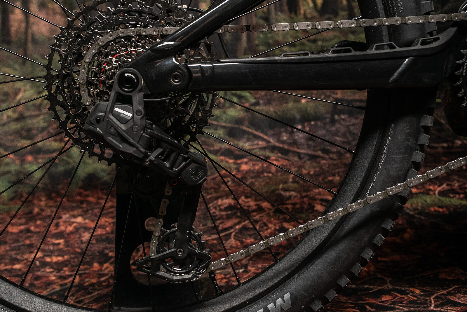 SRAM’s S1000 Transmission drives the back wheel. This drivetrain is super interesting. It’s not available on its own, and only comes on complete bikes. It feels, to me at least, like an awkward transitional option, from before SRAM made cable-driven Transmission. It pairs an almost-GX wireless derailleur with a more affordable two-piece cassette that runs on an HG driver body. That means if you want to upgrade to a lighter cassette, you’ll also need a new driver body or hub. I’d prefer to just get Eagle 90 since it’s lighter and more rebuildable, but I get that folks like electronic shifting. And the Current does ship with the derailleur directly wired to the battery which is nice.