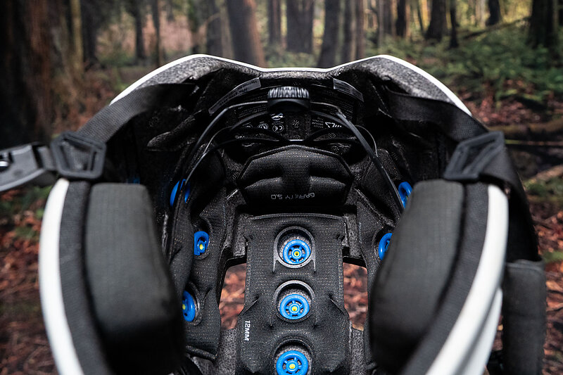 Leatt doesn’t use MIPS, instead they have their own rotational impact tech, called 360° Turbine Evo. These dual-density elastomers are an update of the previous 360° Turbine system and are 10% smaller while also being more flexible. Leatt says that these “turbines” do three things: they absorb smaller impacts, they flex to allow the helmet to move on your head during twisting impacts, and they slide on your head in bigger twisting impacts.