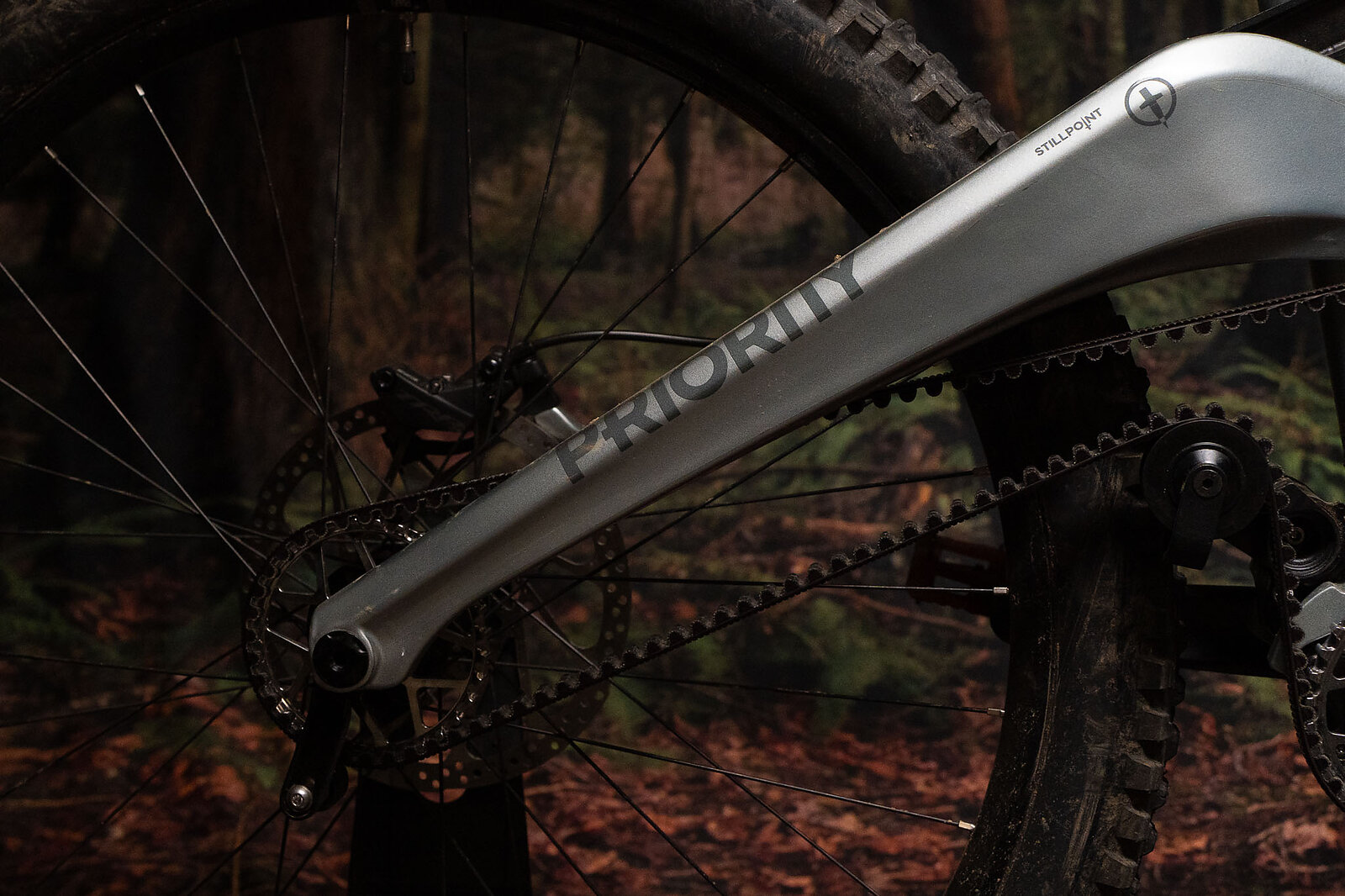 And of course, that belt spins on an idler pulley, because the Vanth’s Stillpoint suspension runs on a high single pivot, which drives the shock with a Knolly-esque pair of links. But, because nothing is simple about this bike, the main pivot and the idler pulley are mounted to the Vanth’s “third member” (it’s not the top tube, or the seat tube, it’s a third tube). This allowed Priority to place the pivot and idler where they wanted to, without being constrained by the rest of the frame’s geometry. A convenient side effect is that this allows for a very straight and uninterrupted seat tube.