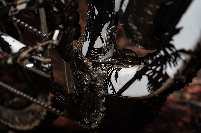 All of the bike’s details have a chunky, industrial aesthetic that jives nicely with the custom-etched hardware and details. This is a premium-feeling frame.