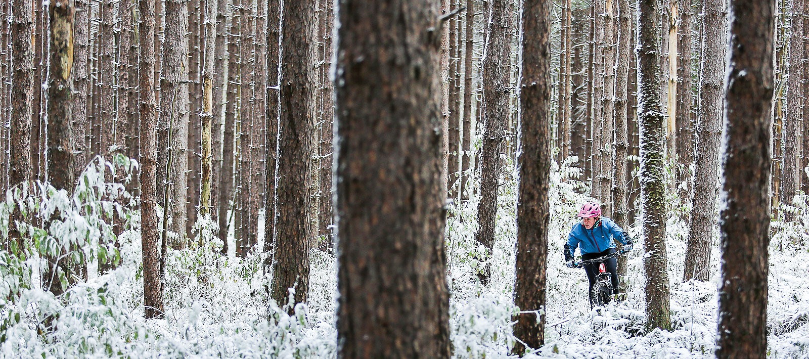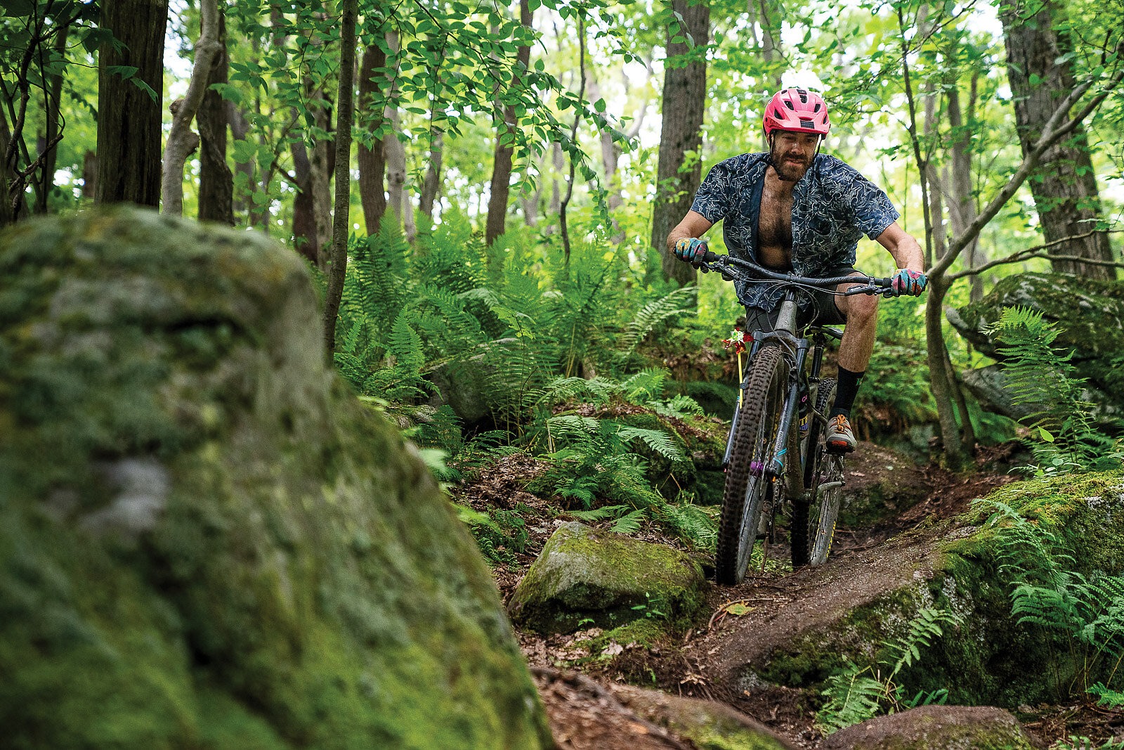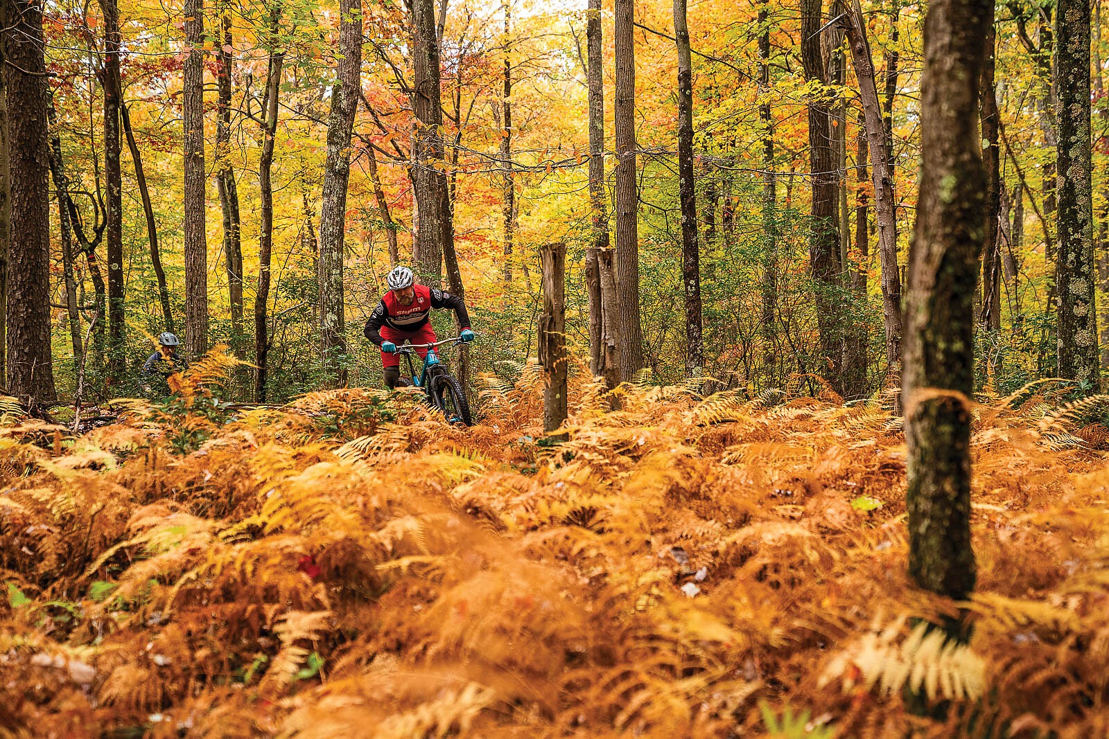 On the group ride, the morning’s chill has given way to a perfect, mild fall day. The group snakes its way up Jump Trail to Damn Connector, a technical climb with plenty of pinch points and rock moves to muscles over. Ratcheting and straining our way to the top, I find myself back where I had begun my morning. Together, we cruise the last stretches of the Race Loop to an area known as The Pines. Here, an almost symmetrical grove of tall pines adds order to the mostly chaotic deciduous forest.