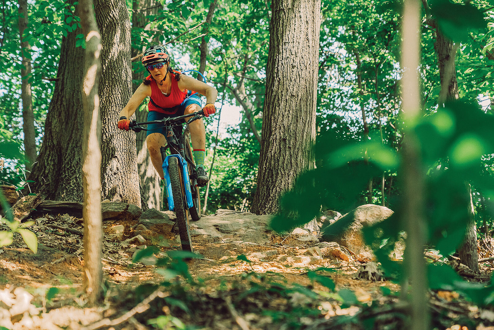 Everything from mountain biking, trail running, fishing, rock climbing, and even horseback riding is there to enjoy within the city’s parks. A distant volley of fireworks breaks through the silence reminding us that it is the Fourth of July holiday weekend, but the calm of the forest is palpable. The breeze drifts through the branches, and all is seemingly serene as Kelly Roberson and I wait for her friend Quinn McGunnigle inside Wissahickon Valley Park. At a little more than 2,000 acres, the woodlands surrounding Wissahickon Creek are home to some of Philadelphia’s more progressive singletrack. The steep slopes of the creek gorge have provided a palette for Philadelphia’s more ambitious trailbuilders. They’ve carved paths in the dirt here since the 1990s. The “Wiss,” as it is affectionately referred to by locals, is home to more than 50 miles of trail. From walking paths to some spicy black diamond chutes, there’s a little something for everyone.