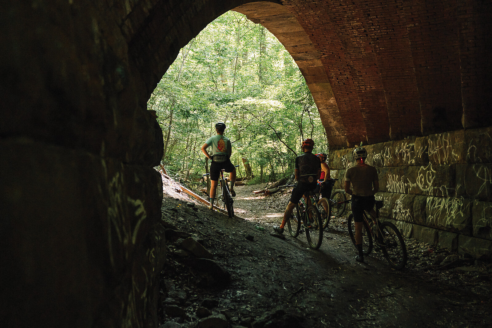 Elsasser, along with Jude Vilan and Elisabeth Reinkordt greet us at one of Belmont’s walking paths. The five of us head out on the Belmont’s Trolley Trail, a twisty ribbon of singletrack that circumnavigates the park following a now-gone, centuries-old trolley track. While the tracks are gone, stone structures and tunnels remain as relics of a bygone era. As we roll along Elsasser yells back: “Hopefully we’ll see Walt!”